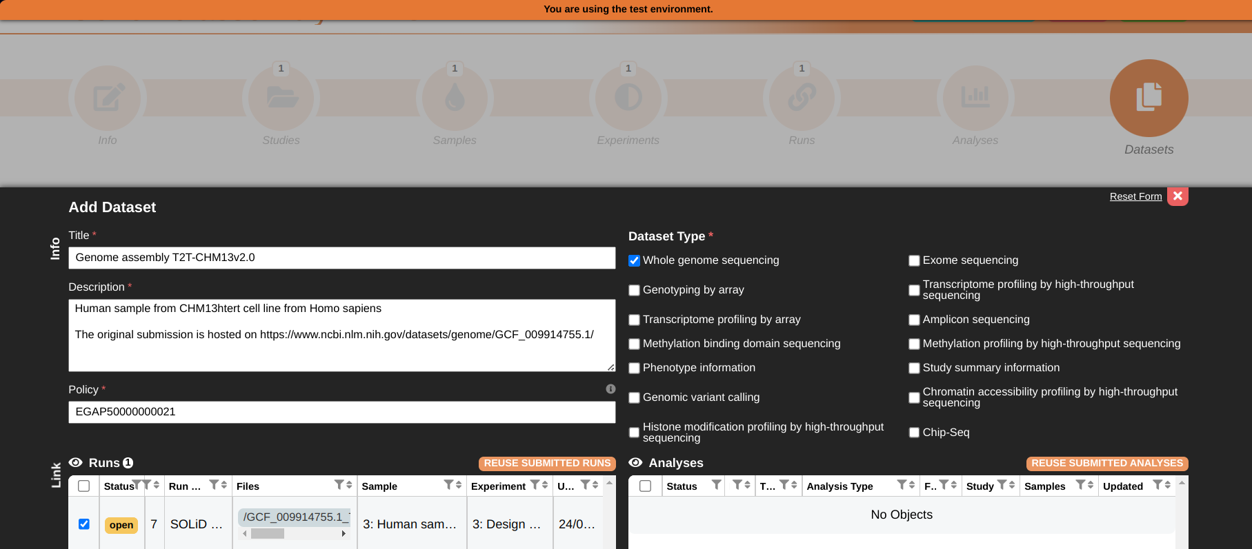 • When you are done filling the metadata for runs and analyses, go to the dataset section and group them into datasets. Each dataset will then need to be linked to a policy, which is managed by a Data Access Committe (DAC), please be sure to contact your DPO or any other person responsible for the submitted data if in doubt how to fill this field.